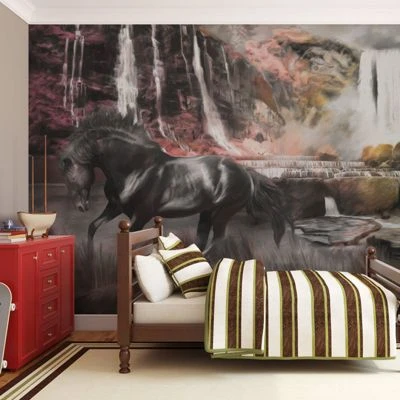 Widerstandsfähige, wasserabweisende und kratzfeste Vliestapete „Schwarzes Pferd am Wasserfall“ zum Anbringen an die Wand. Fototapete „Schwarzes Pferd am Wasserfall“ mit dem inspirierenden Motiv wird zum effektiven Zimmerschmuck jeden Raumes. Vliestapeten werden mittels Kleister an der Wand befestigt. Man kann sie in jedem Raum montieren sogar im Bad oder in der Küche. Vliestapete, halb-matte Beschichtung. 100% Vlies deckt kleine Unebenheiten der Wand ab. Sie schafft eine wärmedämmendene Isolierschicht und erlaubt den Wänden zu atmen. Wasserfester Druck ist sehr beständig. Hochqualitativer Druck
