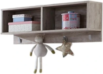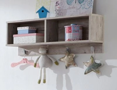 Das CHICCO Wandregal Bente sorgt auf platzsparende Weise für viel Stauraum. Die Hakenleiste im unteren Bereich ist originell und praktisch zugleich.