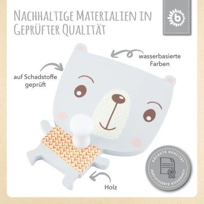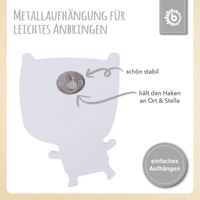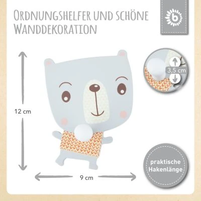 Im Kinderzimmer, im Flur oder bei Oma und Opa, mit diesem schönen Garderobenhaken von Bieco wird Dein Kind gern Ordnung halten. Die kleinen Wandhaken sind ein Hingucker und praktisch zugleich. Der robuste Kinder Kleiderhaken im Katzen Motiv ist aus Holz gefertigt und bewacht Jacken, Rücksäcke und Co., für eine dekorative Wand und ein aufgeräumtes Zimmer. Wähle oder kombiniere zwischen den vier Motiven: Dachs, Hase, Panda und Katze. Gemeinsam schmücken Sie als Garderobe Kinderzimmer oder Flur.Die Marke Bieco steht seit vielen Jahren für höchste Qualität und innovative Produktentwicklung. Unsere Spielwaren für Babys und Kleinkinder unterliegen allesamt den strengsten Richtlinien deutscher Produkt- und Sicherheitsstandards. Bieco möchte Kindergesichter zum Leuchten bringen, deshalb werden alle Designs für unsere Kleinen mit Liebe gefertigt. Artnr: 24850003