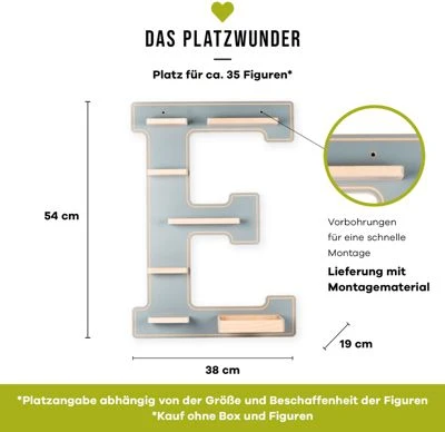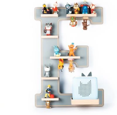 Der Buchstabe „E“ im College Style ist perfekt für Elias und Emilia, Ella und Emil, Emma und Eduard geeignet. Ein klares Statement im Kinderzimmer – und eine coole Sammelmöglichkeit nicht nur für Tonies, sondern auch die zugehörige Tonie-Box. Dank der Einfassung aus hochwertigem Buchenholz können Kinder ihre Box sicher verstaut abstellen. Und durch die Metallstreifen, die an den Regalböden angebracht sind, finden Tonies nicht nur oben, sondern auch unten Platz. Wenn die Figuren kopfüber hängen, sieht das nicht nur witzig aus, sondern spart dazu noch Platz!