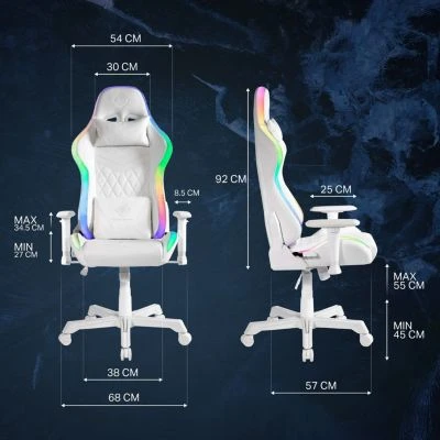 RGB Gaming Stuhl aus Kunstleder mit ergonomischen Ähnlichkeiten zu einem Rennsitz, den Sie in Rallyeautos sehen! Mit hoher Rückenlehne und zusätzlichen Kissen für Kopf- und Rückenlehne haben Sie in diesem Stuhl nach unzähligen Stunden keine Probleme mit Rücken und Nacken. Der Stuhl ist in der Höhe natürlich verstellbar und lässt sich anheben und absenken, ebenso wie die Armlehnen. Die Kissen für den Rücken und den Nacken können ebenfalls für eine optimale Passform angepasst werden.