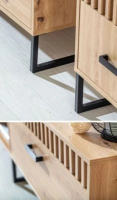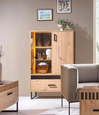 Highboard Modernes Design Ein besonders attraktives Highboard, das mit seinem modernen Design in jedem Zimmer ein Hingucker ist. Dieses Highboard lässt sich hervorragend kombinieren und individuell nutzen. Im Lieferumfang sind zwei verschiedene dekorative Leisten vorhanden. Sie können bei der Montage entscheiden welche Sie anbringen möchten. Es gibt eine schwarze Leiste und eine Leiste mit Lamellen. (siehe Foto unten) Farbe: Artisan Eiche Material: Spanplatte mit pflegeleichter Kunststoffoberfläche, 16mm Ausstattung / Abmessungen (ca. Maße): – mit ABS-Kanten – Griffe aus Metall – Füße aus Metall, 15,5cm hoch – 2 Türen, innen 2 Glasböden & 2 Holzböden – 1 Schublade mit Vollauszug – ohne Beleuchtung – B/T/H: ca. 90 cm / 40 cm / 143 cm