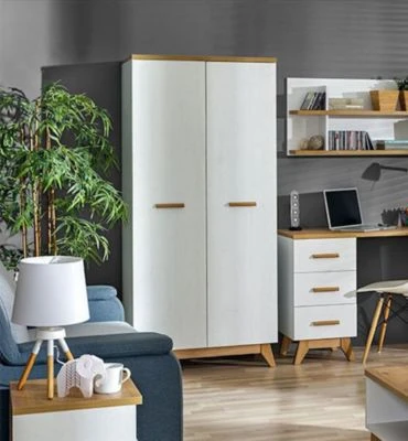 Kleiderschrank Skandinavisches Design Ein funktioneller und praktischer Kleiderschrank, der Ihnen ausreichend Stauraum für Nützliches bietet. Dieser Kleiderschrank lässt sich wunderbar kombinieren. Material: Spanplatte mit pflegeleichter Kunststoffoberfläche Farbe: Nash Eiche / Andersen Kiefer Ausstattung / Abmessungen (ca. Maße): – 2 Türen, innen 1 Boden & 1 Kleiderstange – B/T/H: 85cm / 52cm / 185cm
