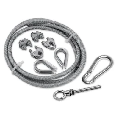 • Lieferumfang: 1 x Stahlseil verzinkt, ca. 5,0 m 2 x Kausche verzinkt 4 x Drahtseilklemmen verzinkt 1 x Augbolzen verzinkt inkl. Mutter & Unterlegscheibe 1x Karabinerhaken verzinkt
