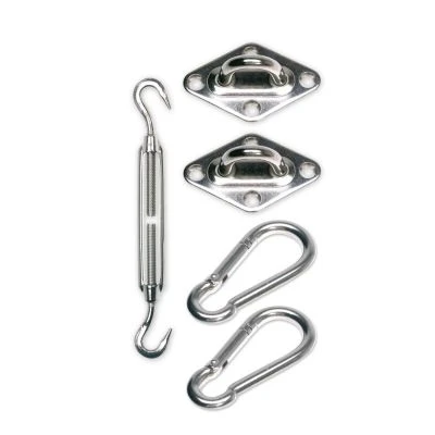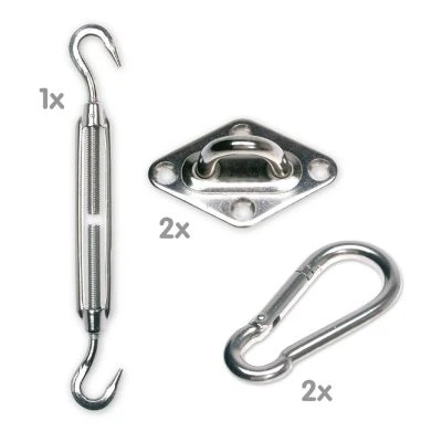Das sehr hochwertige sunprotect Befestigungsset aus V2A Edelstahl beinhaltet alles, was Sie für eine fachgerechte Befestigung Ihres dreieckigen Sonnensegels benötigen.