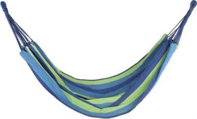 Perfekt für warme Tage ist diese Hängematte von Happy People! Der weiche Stoff ist in sommerlich-frischen Farben gehalten, die an blauen Himmel und grünes Laub erinnern. Der Stoff ist ein hochwertiges Gemisch aus Baumwolle und Polyester und vereint die besten Eigenschaften beider Stoffe in sich. In der bequemen Hängematte können Sie es sich an der frischen Luft so richtig gemütlich machen und warme Sommertage im Garten genießen.