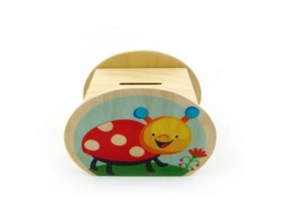 Mit dieser bunten Holzspardose macht das Sparen richtig Spaß. Die Dose hat an der Oberseite einen kleinen Schlitz für das Geld, an der Unterseite einen Deckel mit Schloss und Schüssel. An den Seiten schöne Motive. Alles ist aus Holz gefertigt und teilweise bunt lackiert mit Farben die auf Wasserbasis und lösungsmittelfrei basieren