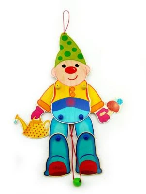 Schöner Figur als Hampelmann Zwerg. Die Figur besteht aus Holz und bunt lackiert mit Farben die auf Wasserbasis und lösungsmittelfrei basieren. Wenn man einer der Schnur nach unten zieht, bewegen sich Arme und Beine