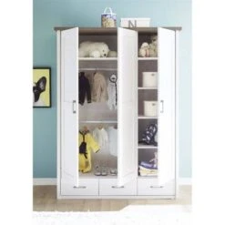 Das Baby-, Kleinkinder- und Jugendzimmer der Serie JOHANNESBURG-43 in weiß mit light grey ist zeitlos und schön. Diese stilbewussten Möbel können dich durch ihre Vielfalt vom Baby bis hin zum Teenager begleiten. Wo einst das Babybettchen mit Schlüpfsprossen stand, kannst du heute zwischen einem gemütlichen Kastenbett mit Ausziehliege für Übernachtungsgäste oder einem modernen Futonbett in 3 verschiedenen Breiten wählen. Wo sich noch vor einigen Jahren deine Wickelkommode befand, steht heute ein höhenverstellbarer Schreibtisch mit flexiblem Rollcontainer und einem schicken Highboard mit extra viel Stellfläche für deine Deko. Auch die Auswahl an Kleiderschränken in verschiedenen Größen lassen keine Wünsche offen. Wer etwas ganz besonderes für sein Zimmer haben möchte, wählt den Eckkleiderschrank mit Falttüren, der dem Jugendzimmer das gewisse Etwas verleiht. Dieser kann bei Bedarf auch mit einer Abdeckplatte inkl. Beleuchtung ergänzt werden. Das vielseitige Jugendzimmer gib es auch in 2 weiteren Farbkombinationen, weiß mit Flagstaff Eiche Nb. und in San Remo Eiche Nb. mit weiß.