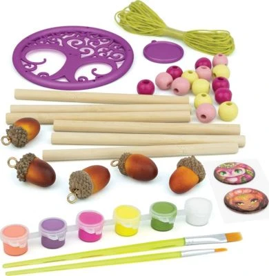 Für alle DIY-Fans kommt mit diesem Set alles zum Basteln und Gestalten eines wunderschönen Windspiels. Wenn die magische Brise des Zauberwaldes durch das Windspiel zieht, bewegt es sich. Mit den beiliegenden Farben und dem Pinsel können die Bambusstäbe bemalt werden und mit den verschiedenen Accessoires – Holzperlen und künstliche Eicheln – verziert werden. Für das Finish sind ein Glitzerlack und Epoxy-Aufkleber enthalten. Toller Bastelspaß mit einer Anleitung mit farbigen Abbildungen.