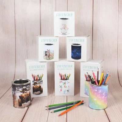 Die vielen Stifte, Pinsel und Scheren finden jetzt endlich einen schönen Platz auf dem Schreibtisch. Der Stifteköcher ist auf jedem Arbeitsplatz ein Hinkucker. Die zylindrische Form bietet einen festen Stand und kippt nicht um. Der Stiftebecher ist komplett mit einer seidenmatten Folie wie abgebildet beklebt.