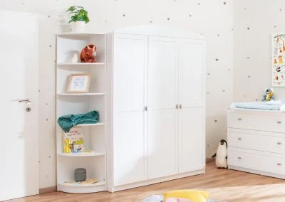 Das Eckregal von Pinolino in schlichtem, eleganten Weiß ist passend zu der Möbelkollektion JIL, LAURA und VIKTORIA.