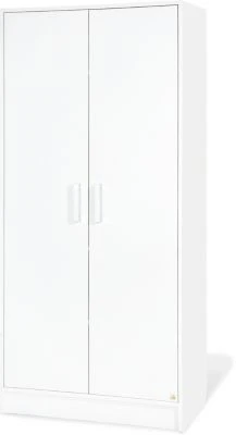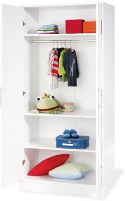 Der Kleiderschrank besitzt zwei Schwenktüren mit drei teils höhenverstellbaren Einlegeböden sowie eine lange Kleiderstange über die gesamte Breite.