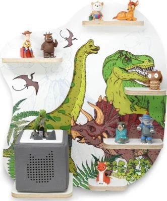 Wer die Toniebox und Tonies schön im Kinderzimmer platzieren möchte, ist mit diesem schönen Regal der Marke stadtecken klasse beraten! Das hübsche Regal im „Dinogigantisch“-Design dient als tolle Dekoration und bietet Platz für die Musikbox sowie bis zu zwanzig Figuren. In das Regal wurden Metallbleche integriert, sodass die magnetischen Figuren nicht herunterfallen können. Das Regal lässt sich einfach an der Wand befestigen, kann aber auch auf einem Regal oder Tisch abgestellt werden. Dank der abgerundeten Kanten besteht keine Verletzungsgefahr für kleine Entdecker*innen.