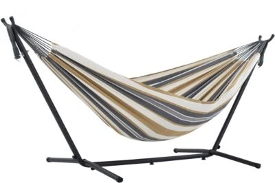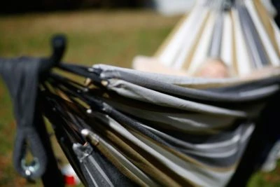 Die Vivere Hängematte zeigt sich im zeitlosen Streifenlook und bietet genug Platz für zwei Personen. Das Modell besteht aus einem engmaschigen, qualitativ hochwertigen Baumwollgewebe und ist somit nicht nur robust und widerstandsfähig, sondern auch besonders hautfreundlich. Die Doppelhängematte kommt praktischerweise gleich mit einem Hängemattengestell, das aus robustem Stahl gefertigt ist und sich in wenigen Minuten aufbauen lässt – und das ganze ohne Werkzeug! Und damit auch das Transportieren ganz einfach geht, ist eine Tragetasche mit im Lieferumfang enthalten.