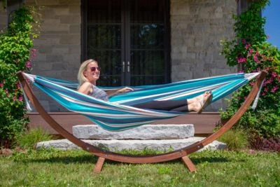Mit dieser Vivere Hängematte mit Gestell können bis zu zwei Personen gleichzeitig eine entspannte Zeit haben und die Seele baumeln lassen. Die Hängematte besteht aus engmaschigem und langlebigem Baumwollgewebe, das noch dazu angenehm hautfreundlich ist. Der robuste Kieferständer lässt sich innerhalb kurzer Zeit aufbauen. Hierfür wird kein Werkzeug benötigt. Dank der enthaltenen Tragetasche ist der Transport ganz einfach.