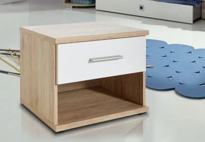 Nachtkonsole modernes Design Moderne und praktische Nachtkonsole in harmonischer Farbkombination. Die Nachtkonsole lässt sich hervorragend kombinieren und die Schubkästen bieten Ihnen ausreichend Stauraum. Material: Faserplatte mit pflegeleichter Kunststoffoberfläche Farbe: sanremo eiche / obere Schubkastenfront weiß Ausstattung / Stellmaße (ca.Maße): – Griff aus Kunststoff, alufarben – mit 1 Schubkasten, Innenmaß: B/T/H 40/30/8 cm – B/T/H: 46 cm / 40 cm / 38 cm